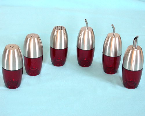 . Set includes: . CS-001: salt shaker . CS-002: pepper shaker . CS-003: cheese powder shaker/cocoa powder shaker . CS-004: oil bottle/vinegar bottle . CS-005: sugar dispenser